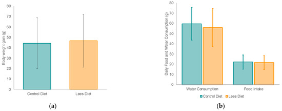 Rats’ body weight gain and daily food and water intake according to the dietary intervention (control or lees diet): (a) body weight gain of rats; (b) food and water consumption by rats.