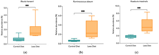 Differences in relative abundance (%) of potentially probiotic bacteria between animals with control and lees diet. Significant differences between groups are indicated with asterisks (*): (a) Blautia hansenii; (b) Ruminococcus obeum; (c) Roseburia intestinalis.
