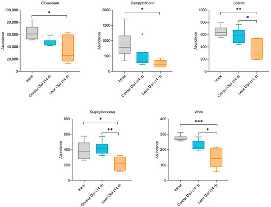 Enterobacteriaceae, which include Salmonella enterica, Shigella spp., and Escherichia coli, are known foodborne pathogens associated with intestinal infections [45]. In the present study, rats with a lees diet showed a tendency to decrease the abundance of such species (data not shown). Nevertheless, when focusing on different genera included in the previously discussed families, we observed significant differences between groups compared to the initial abundance of Clostridium, Campylobacter, Listeria, Staphylococcus, and Vibrio (Figure 3).