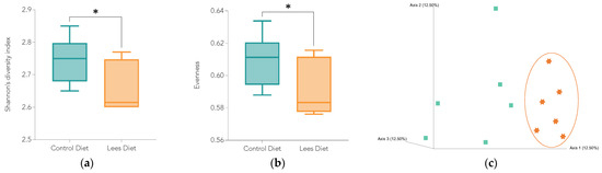 Alpha and beta diversity between animals with control (green) and lees (orange) diet. Significant differences between groups are indicated with an asterisk (*): (a) Shannon diversity index (alpha diversity); (b) evenness (alpha diversity); (c) beta diversity between animals with control (green squares) and lees (orange stars) diet determined by the Bray–Curtis index and principal coordinates analysis (PCoA).