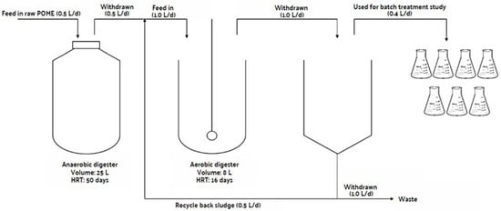 Palm oil mill effluent was taken from a palm oil mill in Penang, Malaysia (5.1785° N, 100.4845° E). The hydraulic retention times were 16 days and 50 days, and the collected raw palm oil mill effluent was pre-treated based on our previous research []. Figure 1 depicts the laboratory pre-treatment process. Table 1 lists the physiochemical characteristics of lab-scale treated POME (LABT-POME).