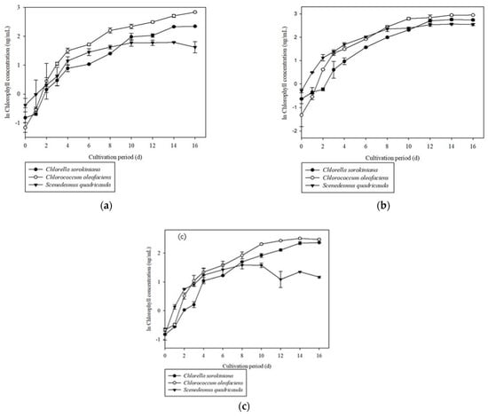 Growth profile of Chlorococcum oleofaciens, Chlorella sorokiniana, and Scenedesmus quadricauda over 16 days in (a) 25%, (b) 50%, and (c) 75% dilution of LAB-POME.