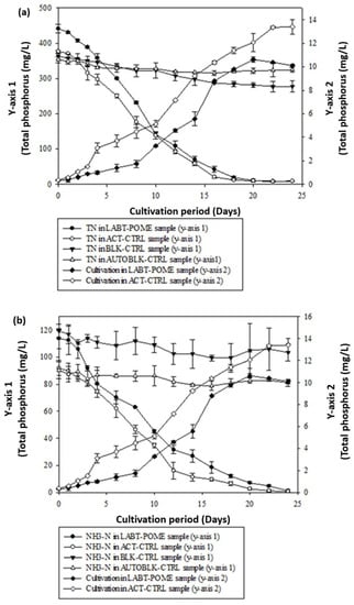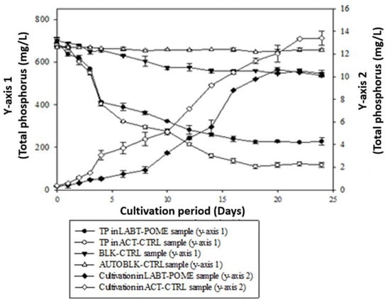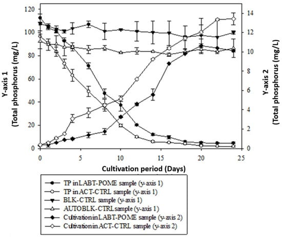 The average chlorophyll-a concentration curve demonstrated that C. oleofaciens grew slowly in the early stages of cultivation, which corresponded to a higher concentration of TP in the medium, indicating that TP uptake was slow. Between days 4 and 14, the concentration of TP decreased considerably in both the actual control and LABT-POME samples. During this period, C. oleofaciens grew exponentially. Consequently, the rate of TP absorption increased. The TP reached equilibrium after 14 days, when its stationary period commenced. C. oleofaciens eliminated 90–95% of TP from LABT-POME and actual control samples within the first 24 days of growth, which was close to the previous study on culture in dairy effluent on an outdoor bench scale, which eliminated 97.5% of TP []. Ding et al. [] similarly reported 89.92 to 91.97 percent TP in an 8-day indoor lab-scale experiment employing microalgae and dairy effluent. Phosphorus is a critical ingredient for microalgal development and metabolism []. It is the skeletal structure of DNA. Its deficiency is one of the limiting variables of algal growth, and its abundance can lead to eutrophication; therefore, it is vital to remove the element from the water column of an ecosystem. At high pH levels, the elimination of TP could be triggered by the assimilation of algae or precipitation []. In this investigation, LABT-POME with a high pH value (8.5 to 9.5) removed the most TP.