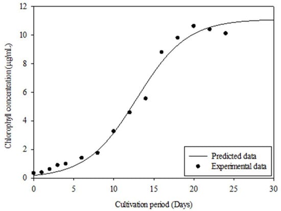 The dynamic of green microalgae growth was calculated using the Verhulst logistical model (Equation (5)) [].