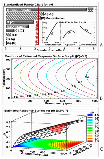 For culture pH: (A) Standardized Pareto chart—columns that surpass the vertical line indicate factors with significant effects on culture pH at a confidence rate of 99%; the insert shows the effects of the variation of granulometry and concentration on culture pH with a fixed WB concentration of 3.7 g/50 mL. (B) Contours of the estimated response. (C) 3D representation of the estimated response surface for a fixed WB concentration of 3.7 g/50 mL, as a function of WB granulometry and agitation. Colors show areas with similar responses, with the optimum shown in red.