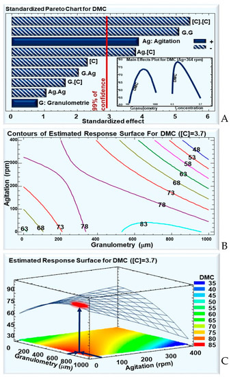 The monitoring of dry-matter consumption (DMC) before and after a 48-h culture allows the tracking of WB consumption by the B. thuringiensis sv. kurstaki strain Lip throughout its growth and sporulation phases. As shown in the Pareto chart, the WB concentration and granulometry had significant quadratic negative effects (C.C and G.G), whereas agitation had a positive linear one (Ag) (Figure 3A). Moreover, a negative interaction effect is seen between the agitation and concentration (Ag.C). This means that DMC increases at a high agitation, when the WB concentration is low, and decreases at a high agitation when the WB concentration is elevated.