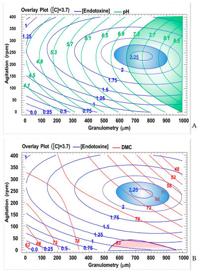 However, as shown in Figure 4B, there is no overlay between the δ-endotoxin concentration optimum (blue) and the DMC (red). This can be explained by previous results that showed the vastly different conditions needed for each parameter, the main variant in this case being the agitation. A high production of δ-endotoxins (ca. 2.25 mg/mL) and a high DMC could both be reached at a granulometry ranging from 680 to 900 μm. However, the former requires an agitation speed between 170 and 270 rpm, whereas the latter does not.