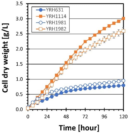 ) strains. Cell dry weight was used to measure cell mass instead of OD600 to account for differences in dry weight per OD600 between haploid and diploid strains. Plots are the average values from at least triplicate cultures. Error bars show standard deviations.