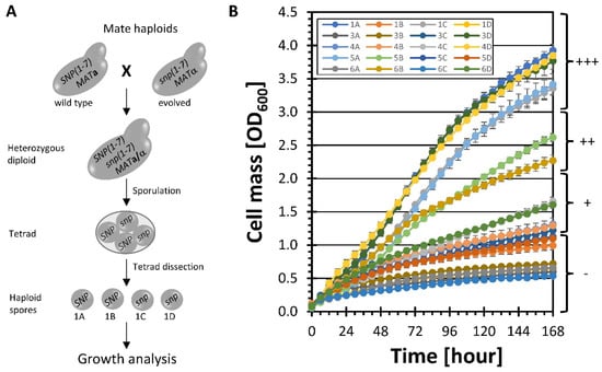 Identification of mutations present in strains with improved growth on xylose. (A) Sporulation of the heterozygous diploid strain YRH1981 was performed to re-distribute SNPs among haploid spores. (B) Each haploid spore was grown on YP medium + 50 g/L xylose to identify strains that maintained the ability to grow well on xylose. Plots are the average values from at least three biological replicates. Error bars show standard deviations. For lower OD values, error bars are smaller than the symbol. Growth ratings (−, +, ++, +++) are used in Table 4.