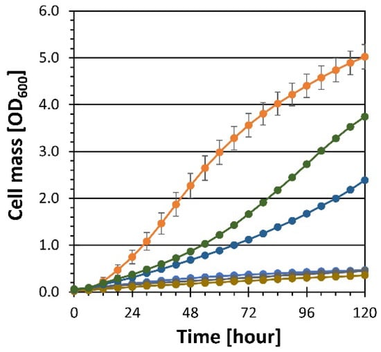 - Kuyper, M.; Toirkens, M.J.; Diderich, J.A.; Winkler, A.A.; van Dijken, J.P.; Pronk, J.T. Evolutionary engineering of mixed-sugar utilization by a xylose-fermenting Saccharomyces cerevisiae strain. FEMS Yeast Res. 2005, 5, 925–934. [Google Scholar] [CrossRef] [PubMed]