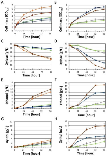 - Träff, K.L.; Otero Cordero, R.R.; van Zyl, W.H.; Hahn-Hägerdal, B. Deletion of the GRE3 aldose reductase gene and its influence on xylose metabolism in recombinant strains of Saccharomyces cerevisiae expressing the xylA and XKS1 genes. Appl. Environ. Microbiol. 2001, 67, 5668–5674. [Google Scholar] [CrossRef] [PubMed]