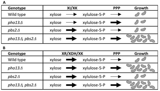 We propose the following model to explain the requirement of both pbs2 and pho13 mutation to improve xylose growth for the engineered strains used in this study (Figure 8). Loss of PHO13 function has been shown to increase expression of PPP enzymes [], which is required for general xylose metabolism. For strains expressing the XI pathway, cells with just pho13Δ are still limited in xylose conversion to X5P (Figure 8A). Cells with pbs2Δ, which likely acts like a hog1Δ strain because PBS2 is required for HOG1 function [], have increased xylose conversion to X5P, but are then limited by poor flux through the PPP due to the presence of PHO13. When utilizing the XI pathway, both gene deletions are required to get xylose into central metabolism and allow cell growth. Conversely, for cells expressing the XR/XDH pathway for xylose metabolism, X5P production is not as limiting a factor. Thus, increased flux through the PPP from deletion of only PHO13 would be expected to increase growth on xylose (Figure 8B). Previous studies using multiple different genetic backgrounds are consistent with this model. These studies show that deleting only PHO13 in strains using the XR/XDH pathway increases xylose utilization [,,,,]. Several of these studies utilized different genetic backgrounds. Different XI and XK genes were also used compared to ours, suggesting that the results with respect to PHO13 deletion are not unique to specific strain backgrounds or xylose isomerases.