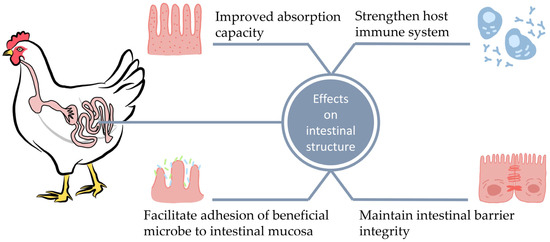 Poultry health status and improved growth efficiency are strongly correlated with the gut condition and intestinal microflora. The intestines play a very important role in the digestive tract of birds as they harbor a diverse community of beneficial microbes, which degrade complex nutrient compounds into simpler molecules that are more easily assimilated and metabolized [53,54]. The structural organization and adherence properties of the gastrointestinal epithelial cells are crucial for nutrient absorption and the protection of the bird’s body from pathogenic microbes that could infiltrate the bloodstream [55]. The most important parameters associated with the higher nutritional absorption resulting from larger surface area available for nutrient assimilation are those related to intestinal morphology, i.e., increased villus height, a lower crypt depth, and the higher villus height to crypt depth ratio [56]. Sound gastrointestinal microbiota is the prime requirement for avoiding microorganism infections in the gastrointestinal tract of birds. This is achieved by preventing microorganism colonization through pathogenic bacteria antagonism, inhibition of adhesion sites in the gut and impediment to bacterial exercises [57]. Similarly, another marker of gastrointestinal health status is the amount of gastric mucosa, which produces mucin and prevents pathogenic organisms from adhering to mucosal surfaces [58]. Even though the intestinal microflora is relatively stable, it is still affected by numerous environmental factors (feed composition, hygienic standards, physical stress, etc.) and overall health condition of the animal. However, the key element with the greatest impact on intestinal microflora is diet. Probiotics are commonly used for intestinal flora regulation [59] and improvement of gastrointestinal histomorphology; however, the potential effects may slightly differ from one strain to another [60]. Dietary supplementation of broilers with Lactobacillus plantarum and Lactobacillus reuteri significantly affected barrier activity and reduced colonization by certain opportunistic or pathogenic microorganisms [61].
