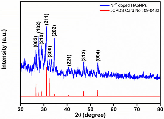 Ni2+-doped HApNPs exhibit a crystalline phase in the form of hexagonal HApNPs with well-defined diffraction peaks in the conventional X-ray diffraction (XRD) pattern (JCPDS: 09-0432), as shown in Figure 1. Hexagonal HApNPs doped with Ni2+ have been shown to have a P63/m space group. At 2θ = 26.61°, 27.93°, 28.87°, 31.21°, 32.58°, 34.50°, 40.59°, 47.16°, and 53.15°, diffraction peaks were seen that corresponded to the (002), (102), (210), (211), (300), (202), (221), (312), and (004) planes, respectively. Significantly, the crystal system is unaffected by the PEG surfactant.