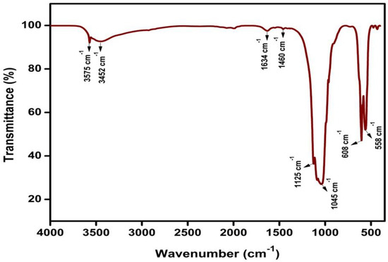 Figure 2 depicts the FTIR spectrum of Ni2+-doped HApNPs. Frequencies of 558 cm−1 and 608 cm−1 were assigned as the O-P-O bending mode. The 1040–1140 cm−1 range contains bands with a high intensity that have been assigned to the v3 asymmetric stretching mode of O-P-O. The presence of v3 carbonate ions (CO3−2) from the environment during sample preparation has been connected to the weak bands identified at 1460 cm−1. However, the band at 1634 cm−1 is easily explained due to the lattice’s two H2O, H-O-H bending modes. It has been determined that the OH stretching contributes mild intensity to the appearance of two bands in the HApNPs, one wide at 3452 cm−1 and the other sharp at 3575 cm−1. Water in the lattice, rather than absorbed water, is responsible for the persistence of the OH bands even at elevated temperatures. After all, at temperatures over 100 °C, absorbed moisture is evaporated. XRD analyses corroborate these results, suggesting that Ni2+ ions are present in the HAp structure.