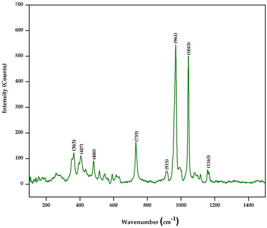 Figure 3 illustrates the Raman spectrum of Ni2+-doped HApNPs. Raman spectra of Ni2+-doped HApNPs revealed vibrational bands related to phosphate group stretching and twisting modes. Most significantly, at 961 cm−1, the symmetric stretching way of PO43− (v1)—one can always recognize this peak as belonging to HApNPs. The low-intensity band at 363, 407, and 480 cm−1 is responsible for the bending behavior of PO43− (v2symmetric). In this investigation, a band at 614 cm−1, estimated at around 591 cm−1, matches the irregular bending style of PO43− (v2). It has been determined that the band saw at 1043 and 1163 cm−1 in the Raman spectra of Ni2+-doped HApNPs is due to mild PO43− (v3) stretching. There is strong agreement between our findings and the previously published values [5].