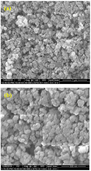 FESEM images of Ni2+-doped HApNPs (a) 40,000×, (b) 80,000×.