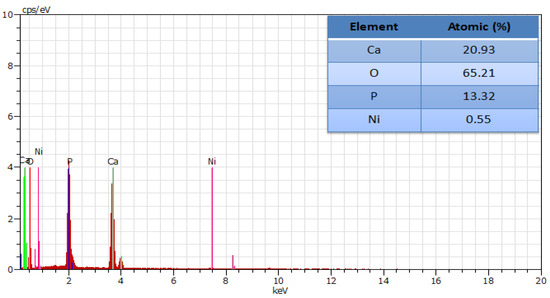 The EDAX spectrum (Figure 5) reveals the stoichiometric occupancy of Ca, O, Ni, and P, proving the synthesis of Ni2+-doped HApNPs and ensuring that the models are in accordance with the HApNPs’ fundamental ingredients and stoichiometry. The existence of P, O, Ca, and Ni may also be confirmed. The EDAX spectrum did not show any secondary phase or contamination signals. This sample elemental analysis confirmed the presence of Ca, O, P, and Ni in Ni2+-doped HApNPs.