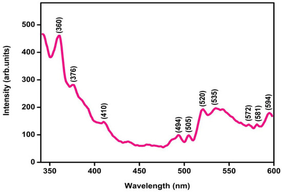 The PL emission spectra of Ni2+-doped HApNPs synthesized through sol–gel synthesis are shown in Figure 6. The PL emission peaks of Ni2+-doped HApNPs are located between 340 and 600 nm. Emission peaks were measured at 360, 376, 410, 494, 505, 520, 535, 572, 581, and 594 nm for the Ni2+-doped HApNPs. Current research indicates that HAp and MOFE: HAp nanorods (NRs) have similar PL, with a wide visible emission band of about 310 nm. When UV light was applied to HApNPs, holes formed in the material that UV-induced trapholes might exploit, and both band gaps (5.2 and 5.5 eV) were also preserved [10].