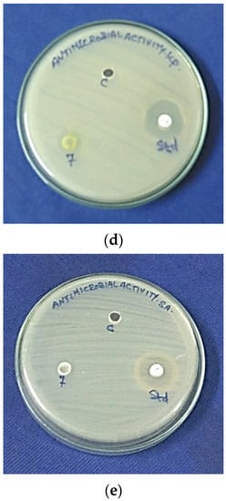 Figure 7 shows the zone of the inhibitory effect of the five most prevalent pathogenic microorganisms. Furthermore, the optimal concentration was 50 g. Ni2+-doped HApNPs were discovered to exhibit a maximum inhibition zone against E. coli of around 22 mm, demonstrating potent antibacterial action. The zone of inhibition shown by P. aeruginosa was rather large, measuring about 19 mm. The growth inhibitory impact of bacteria was modest against S. flexneri and K. pneumoniae. Minimal inhibitory zones were seen for S. aureus (Table 1). The finding demonstrates the high antibacterial activity of the produced Ni2+-doped HApNPs. Similarly, a recent study [31] reported that Ni2+-doped HApNPs showed remarkable antibacterial action against E. coli and S. aureus.