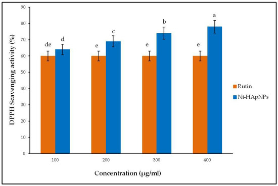 Ni2+-doped HApNPs antioxidant activity was tested using diphenyl phosphate (DPPH), and the results revealed that the free radical scavenging function of the HApNPs increased with increasing concentration (Figure 10). Ni2+-doped HApNPs demonstrated superior scavenging performance. In contrast, standard Rutin only managed 60% efficiency over the whole concentration range (100 to 400 µg/mL). Thus, Ni2+-doped HApNPs are the best option due to their superior antioxidant process. Studies using a similar design have connected the formulation’s 1,1’-diphenyl-2-picrylhydrazyl and hydrogen peroxide scavenging capabilities to stable ascorbic acid, with the increased activity mainly related to the presence of phenols and flavonoids [37,38].