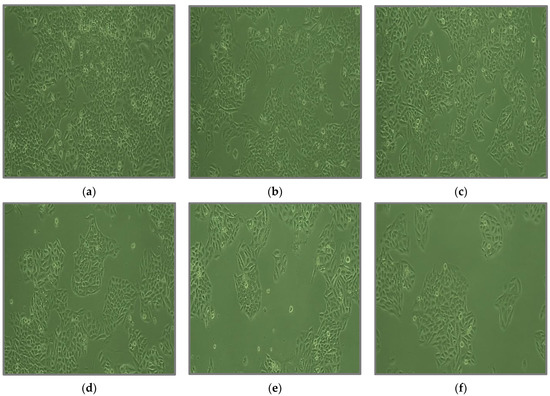 Anticancer activity of Ni2+doped HApNPs. (a) control, (b) 6.25 µg/mL, (c) 12.5 µg/mL, (d) 25 µg/mL, (e) 50 µg/mL, (f) 100 µg/mL.