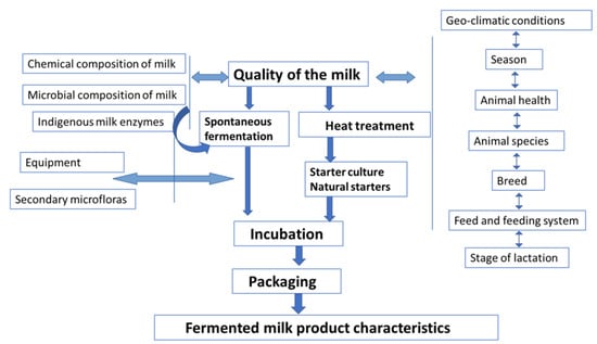 Milks of various mammal species are used for the manufacture of fermented milk products differ in chemical composition, including significant differences in parameters such as total solids, lactose, fat, protein, and mineral content (Table 1). There is great variation in the chemical composition of milk from the same species and many factors may affect the gross composition of milk; the factors most significantly affecting the processing of milk products are geo-climatic conditions, animal health, breed, feed, season, and the stage of lactation (Figure 1). Cow’s milk is the basis for most dairy fermented products around the world. Milk from other mammals, including sheep, goat, camel, mare, buffalo, and yak may have been historically more important and remain so in certain regions []. South European countries as well as many Asian, African, and other Mediterranean countries have centuries of tradition in small ruminant farming, such as ewes and goats, and a number of fermented dairy products are manufactured worldwide []. Likewise, milk and fermented milk products from domesticated animals such as yak are common dairy commodities in the Himalayas and neighboring regions []. There are other mammals used to produce fermented milk products worldwide, for example, the hybrid of domesticated yaks and cows in Kyrgyzstan, Tajikistan, Mongolia, Buryatia, Pakistan, and Tibet [].