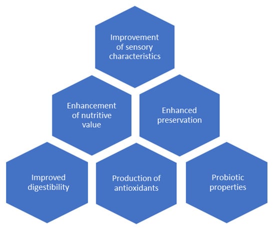 Fermented milks are recognized as one of the most popular fermented products due to their extended shelf life and characteristic organoleptic properties, as well as, for their health benefits [,,,,,,,]. The functions that have been associated with fermented milk products are schematically shown in Figure 2.