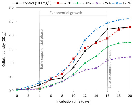 Nitrogen is one of the most essential macronutrients for microalgal growth as it is incorporated in lipids, proteins, and carbohydrate synthesis as well as the formation of nucleic acids [30,31]. The effect of different sodium nitrate concentrations on growth pattern of Chlorella sp. was evaluated, which showed the end of exponential growth phase at the 16th day of incubation (Figure 1). Results confirmed pronounced effect of nitrogen concentration on the microalgal growth. Reduction of NaNO3 showed reduction of cellular density while, increasing of NaNO3 by 25% enhanced the growth over the control. The same results were confirmed by biomass, where 25%, 50%, and 75% reduction of NaNO3 showed significant reduction in the cellular dry weight by 13.7%, 28.5%, and 50.6%, respectively, compared to the control (Table 1). However, increasing of NaNO3 by 25% resulted in significant increase in the dry weight and biomass productivity by 14.5% and 12.3%, respectively, over the control. Inhibition of photosynthetic efficiency is a typical response of microalgae for nitrogen limitation due to the strong relationship between pigment synthesis and nitrogen metabolism [32,33,34], where a 1.5–2.5-fold reduction in five proteins of N-starved diatom Thalassiosira pseudonana is involved in the synthesis of chlorophyll [35].