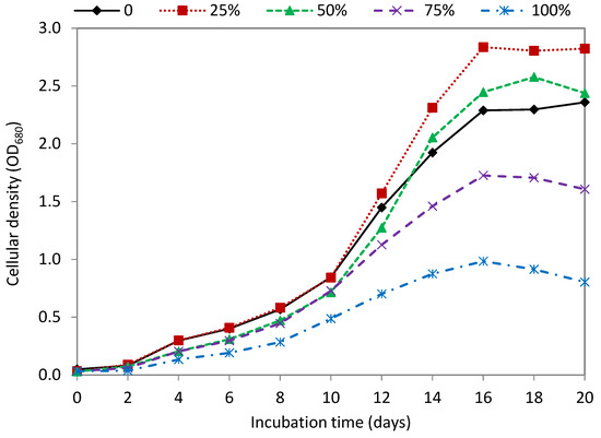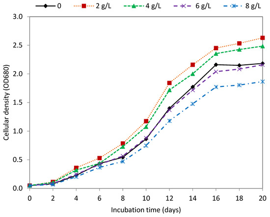 Cellular growth was measured every other day by monitoring the optical density at 680 nm (OD680). To calculate biomass productivity (Equation (1)), algal cellular dry weight (CDW) was measured by filtration of 10 mL of the culture through 0.45 µm pore size pre-weighted filter, then dried at 105 °C until of constant weight.