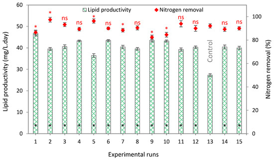 Lipid productivity and nitrogen removal by Chlorella sp. cultivated at different sodium nitrate concentrations, seawater ratios, and glycerol supplementation using randomized central composite design as shown in Table S1. * and ns represent significant and non-significant differences, respectively, with respect to the control (Run #13) at p ≤ 0.05.