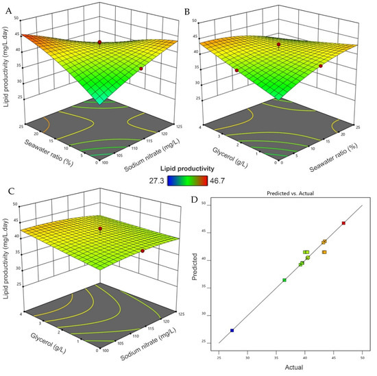 Central composite design showing the lipid productivity responses to different studied conditions of sodium nitrate, seawater, and glycerol (A–C) with the fitting graph of actual and predicted values (D).