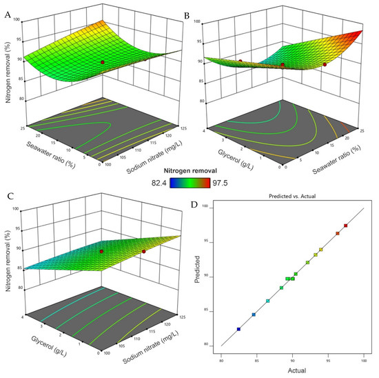 Central composite design showing the nitrogen removal responses to different studied conditions of sodium nitrate, seawater, and glycerol (A–C) with the fitting graph of actual and predicted values (D).