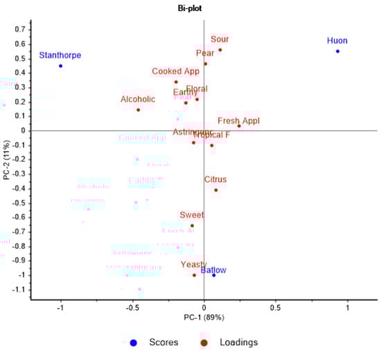 Using descriptive analysis, the three regions were differentiated by some of the sensory attributes tested. The influence of environmental factors on sensory quality is commonly reported in wine research [,,,]. Sadras et al. [] elevated the temperature of the grapevine to simulate increased region temperatures and found for Semillon, green and citrus aromas were reduced while tropical flavours and rich mouth feel was enhanced. This contrasts with findings from this study where the lowest mean maximum monthly temperatures (Huon Valley) where apples were grown produced cider that was more closely associated with the characteristics ‘Citrus’ and ‘Tropical Fruit’. Huon Valley was the coldest region and received the least solar exposure. Using the PCA (Figure 1) cider made using apples grown in Huon Valley, was associated with ‘Fresh Apple’, could be loosely associated with ‘Citrus’, according to the X axis and was the least likely region to be associated with “Earthy”. This demonstrates the influence that regions, through differences in climate conditions, influence the quality of fermented beverages as determined by sensory analysis. A similar result was found upon investigating the regional effects on sensory in wine, Schlosser et al. [] discovered when there were colder temperatures during berry maturation, and less solar exposure, the wine could be characterised by ‘Apple’, ‘Melon’, and ‘Citrus’ and ‘Acidity’, and low in ‘Grassy’ and ‘Earthy’.
