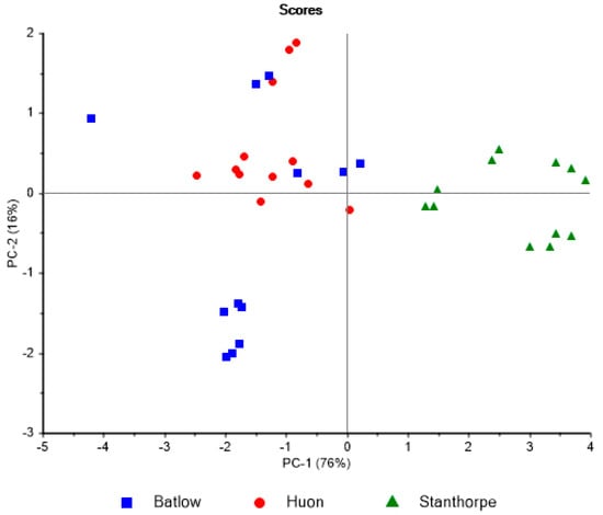 Scores plot for principal component analysis (PCA) for all four base chemical parameters of ciders made using “Fuji” apples from Huon Valley, Batlow and Stanthorpe (n = 12 per region, per parameter).