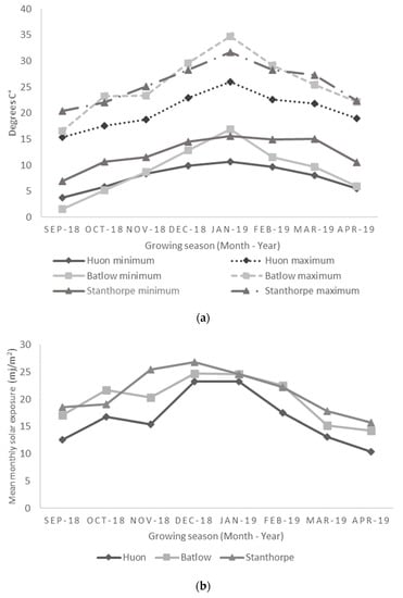 Weather data for each growing region during the 2018/2019 growing season including; monthly mean minimum and maximum temperature (°C) (a), mean monthly solar exposure (MJ/m2) (b) and accumulated growing degree days (base 10 degrees) (c).