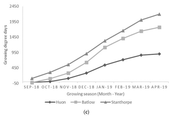 All climate data was collected using the Australian Bureau of Meteorology website []. The closest weather stations to the orchards used were selected (as reported in Table 1) and the data for monthly mean, maximum and minimum temperature, and monthly mean solar exposure was gathered. To calculate growing degree days (GDD), the daily mean temperature was calculated by adding the mean daily maximum temperature to the mean daily minimum temperature and dividing the result by two then subtracting 10 (GDD = [(daily maximum temperature + daily minimum temperature/2) − 10 °C]). Rainfall was not considered in this study as apple growers irrigate to ensure adequate soil water content.