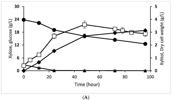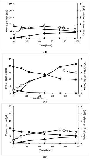 C. tropicalis is an excellent yeast for converting xylose to xylitol [30]. Like the xylose consumption pattern in D. hansenii, C. tropicalis also consumed more xylose in the enzymatic hydrolysate. The percentage of C. tropicalis that consumed xylose from enzymatic hydrolysate was 49.600%, while that which consumed glucose was 98.370%. The consumption of xylose from acid hydrolysate was 40.490%, while for glucose, it was 99.400%. In summary, the xylose consumption in enzymatic hydrolysate by C. tropicalis was higher than by D. hansenii, while there was no significant difference in xylose utilization in acid hydrolysate between the two yeasts. A graph of the decrease in xylose and glucose concentration during C. tropicalis fermentation is presented in Figure 1C,D.