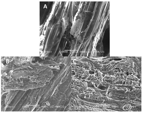 Scanning electron microscope images of fresh OPEFB (A), after enzymatic hydrolysis (B), after acid hydrolysis (C).