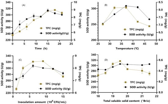 After the fermentation strains and ratios were determined, SOD activity and TPC values obtained after fermentation were used as indicators. The single-factor experimental conditions for FBMJ production were as follows: soluble solid content (18.5, 19, 19.5, 20, and 20.5 °Brix), inoculum volume (1, 3, 5, 7, 9, and 12 × 106 CFU/mL), fermentation temperature (27, 32, 37, 42, and 47 °C), and fermentation time (3, 6, 9, 12, 15, 18, 21, and 24 h).