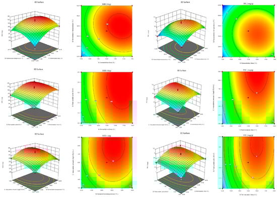 It can be seen from Table 2 that the two regression equation models were highly significant (p < 0.0001), while the result of the lack of fit test was not significant. The correlation coefficient R2 value for SOD activity was 0.9814 and the R2 value for TPC was 0.9718, indicating a good degree of fit between the measured value and the predicted value and that the process parameters of FBMJ could be analyzed and predicted.