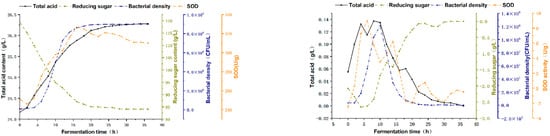 The fermentation temperature influences the metabolic activity of lactic acid bacteria, which in turn affects the fermentation quality []. As can be seen in Figure 1B, SOD activity reached its highest value (309 U/g) at 37 °C and then showed a decreasing trend with increasing temperature. The concentration of total phenols gradually stabilized at 8.15 mg/g at 37 °C and then showed a rapid downward trend above 37 °C. At high temperatures, bacterial intolerance to heat leads to a decrease in enzyme metabolism and activity [], which consequently affects the biotransformation of phenolic substances in the system. Moreover, phenolic substances are readily degraded at high temperatures. Therefore, 37 °C was chosen as the optimal fermentation temperature.