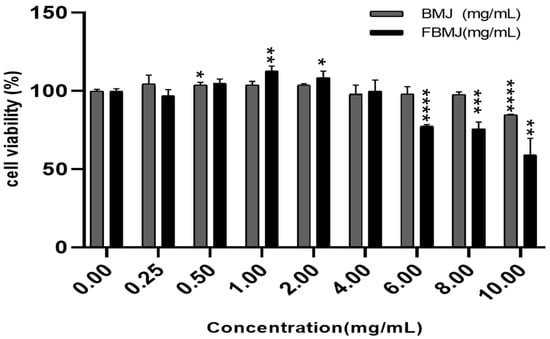 In this study, we used H2O2-treated C2C12 cells to construct an in vitro oxidative stress model to evaluate the antioxidant function of FBMJ. After 24 h of treatment with either BMJ or FBMJ at concentrations of 0, 0.25, 0.5, 1, 2, 4, 8, and 10 mg/mL, C2C12 cell viability was determined using the CCK-8 method (Figure 4). As shown in Figure 4, FBMJ concentrations below 4 mg/mL had no apparent toxic effect on the cells, and instead showed a certain promoting effect on cell proliferation. When the concentration of FBMJ was 1 mg/mL, the cell viability increased by 12.96%. In the subsequent oxidative damage protection experiments, 0.5–2 mg/mL of BMJ and FBMJ were selected as the experimental concentrations with an administration time of 24 h.