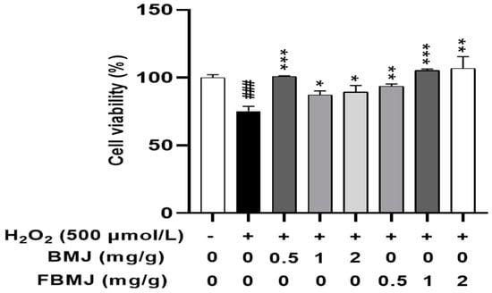 The effects of BMJ and FBMJ on the survival rate of 500 μmol/L H2O2-oxidatively stimulated C2C12 cells compared with the control group (### p < 0.001) and damaged group (* p < 0.05, ** p < 0.01, *** p < 0.001.).