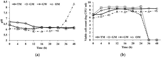 Notably, the observed changes in total microbial counts for TM, GM, and GW fermentation followed the similar trends reported previously by Park et al. [17]. In the case of OM, W. anomalus (optimal pH = 3.5~7.0) used as inoculum has properties that allow its grown and survival under extreme environmental stress conditions including low water activity, high osmotic pressure, and anaerobic conditions, which might have contributed toward its high cell viability during fermentation [26].
