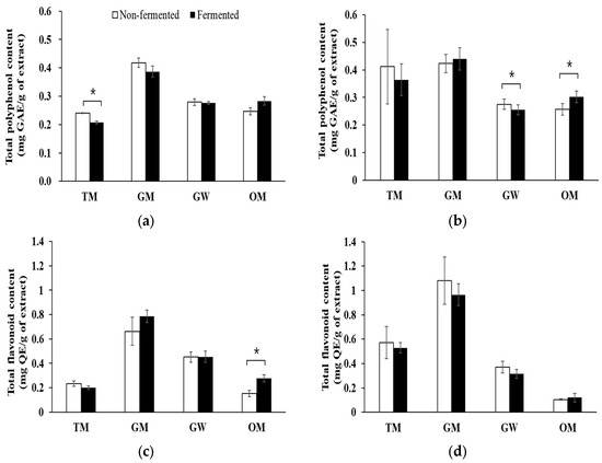 TPC and TFC of HWE and EE after fermentation for 5% (w/v) turmeric, ganghwa mugwort, glasswort, and omija. * p < 0.05; (a) TPC-HWE; (b) TPC-EE; (c) TFC-HWE; (d) TFC-EE; TM: turmeric; GM: ganghwa mugwort; GW: glasswort; OM, omija.