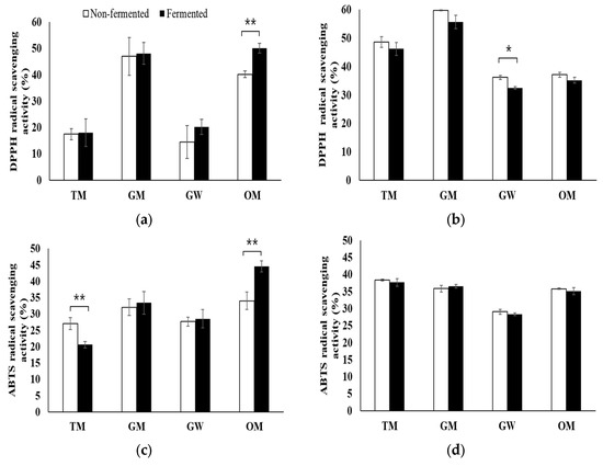 As shown in Figure 2c,d, total flavonoid content (TFC) from the HWE increased after fermentation, especially for OM with significantly differences compared to the non-fermented one. In contrast, TFC for the EE decreased after fermentation. The health functions of polyphenols, including flavonoids, serve as powerful antioxidants due to their ROS scavenging activities, thereby suppressing the pathogenesis of age-related degenerative diseases, such as diabetes, cardiovascular diseases, cancer, and neuro-degenerative malfunctions [30].