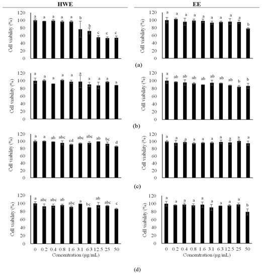 Cell viability of kidney LLC-PK1 cells. Cytotoxicity tests of fermented medicinal plants from HWE and EE. The same letters have no significant differences. (a) TM; (b) GM; (c) GW; (d) OM.