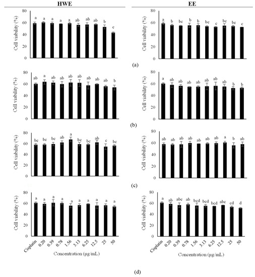 Cell viability against cisplatin-induced oxidation to assess the protective effects on kidney cells of (a) turmeric; (b) gangwha mugwort; (c) glasswort; and (d) omija. The same letters have no significant differences.