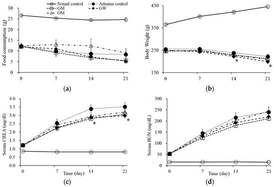 Changes in serum creatinine and BUN level of control and adenine-induced chronic kidney injury SD rats treated with test materials for the experimental period. * p < 0.05; (a) Food consumption; (b) body weight; (c) serum creatinine level; (d) serum BUN level; GM: ganghwa mugwort; GW: glasswort; OM, omija.